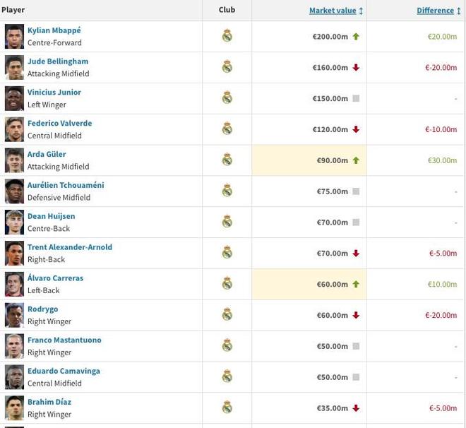 北京时间12月12日,德转市场更新西甲球员身价,皇马队内姆巴佩较上期上升2000万欧,目前身价2亿欧,贝林厄姆下降2000万欧至1.6亿欧。